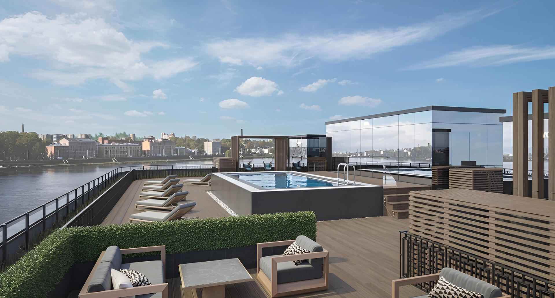 Особое место занимает крыша комплекса, превращённая в общественное пространство. Здесь расположены бассейн с подогревом, лаунж-зона, бар и зоны отдыха. Это не только элемент благоустройства, но и важный социальный центр, создающий уникальную атмосферу внутри комплекса.