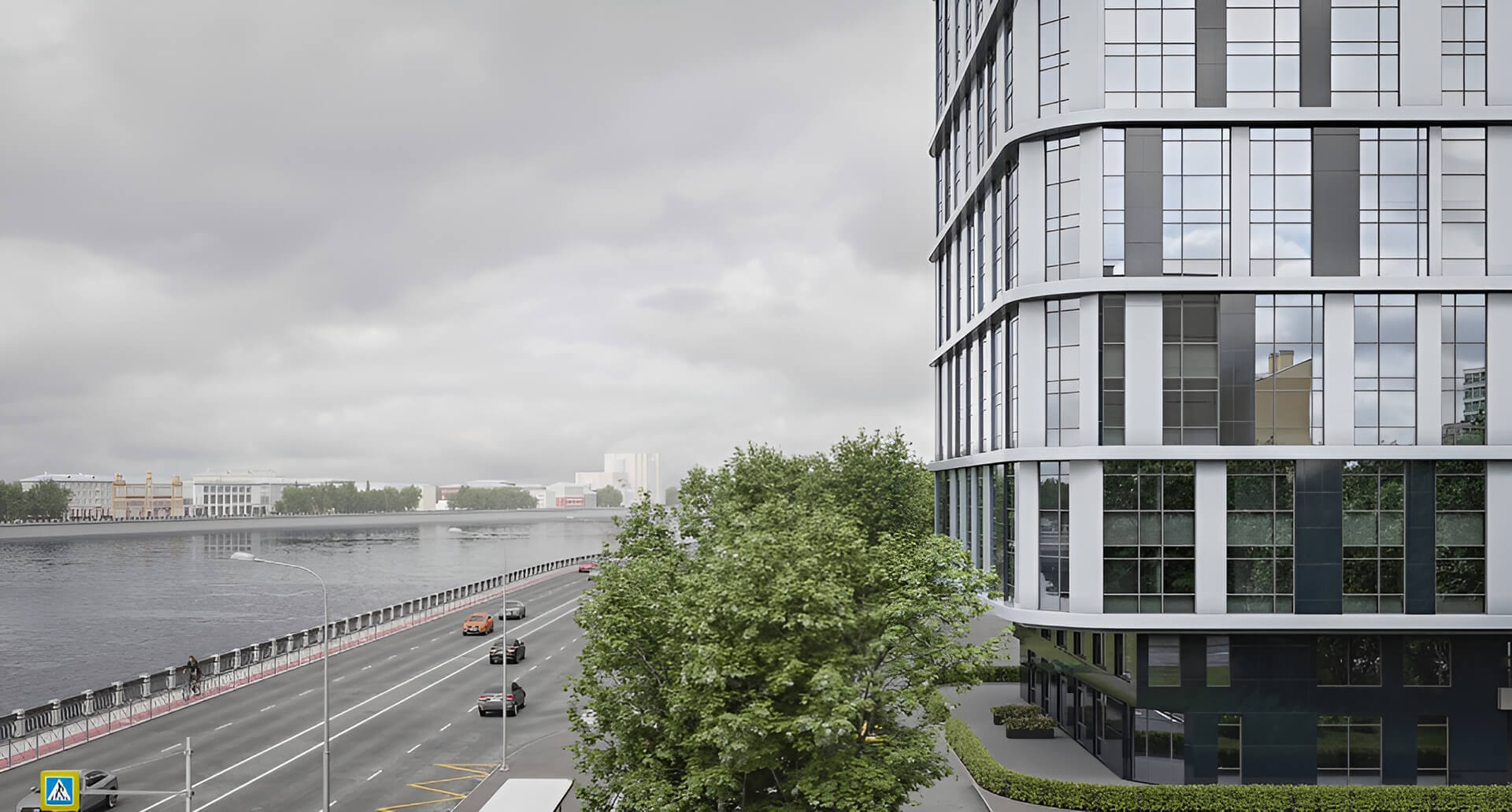 Ландшафтное оформление подчёркивает близость к Неве. Пространство дополнено зелёными насаждениями и современными элементами благоустройства, создающими гармонию между урбанистическим стилем и природным окружением.